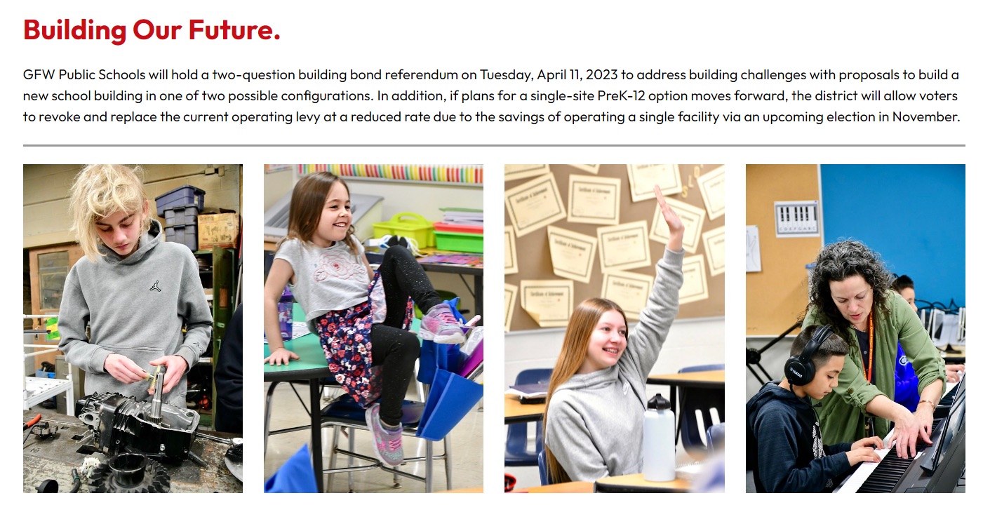 The recent success of Gibbon-Fairfax-Winthrop’s $69.9 million referendum for a new Pre-K-12 facility has proven that running a student-centered campaign can win over divided communities. The campaign strategy, referendum logo, and tagline focused on “Building Foundations For Future Leaders” by outlining opportunities for a prepared workforce, a safe learning environment, future generations, and growth in fine arts and athletics.