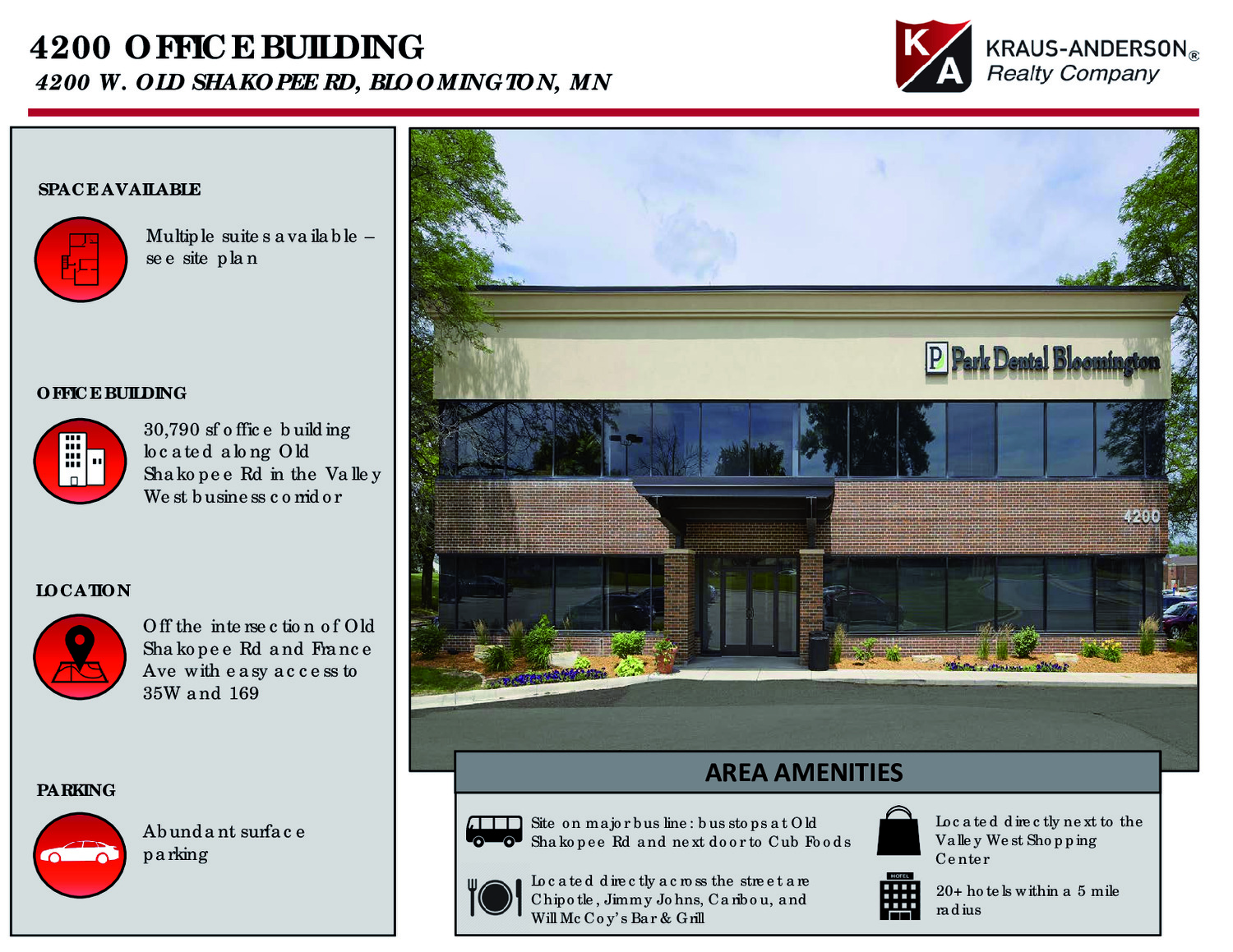 Located on the north side of Old Shakopee Rd. just west of France Avenue in Bloomington. This property offers easy access to both 35W and Highway 169, abundant surface parking and lots of retail, fitness and restaurant amenities such as Caribou, Mugshots, Jimmy Johns, Chipotle, Wily McCoy's, Cub Foods, Planet Fitness, etc.