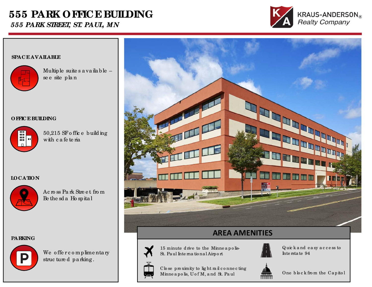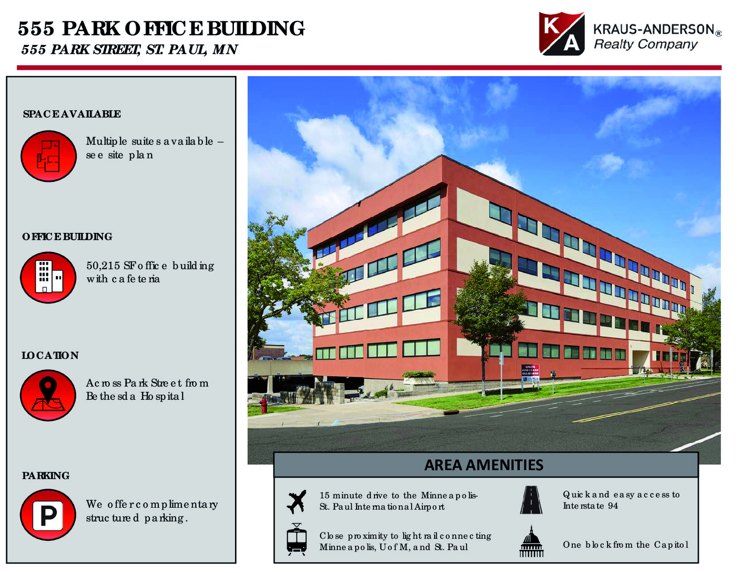 Updated and value-priced, this four-story multi-tenant office building is located a block north of the state capitol, just off the St. Paul’s Green Line and offers flexible suite sizes, free on-site parking and shared gathering/cafeteria space.