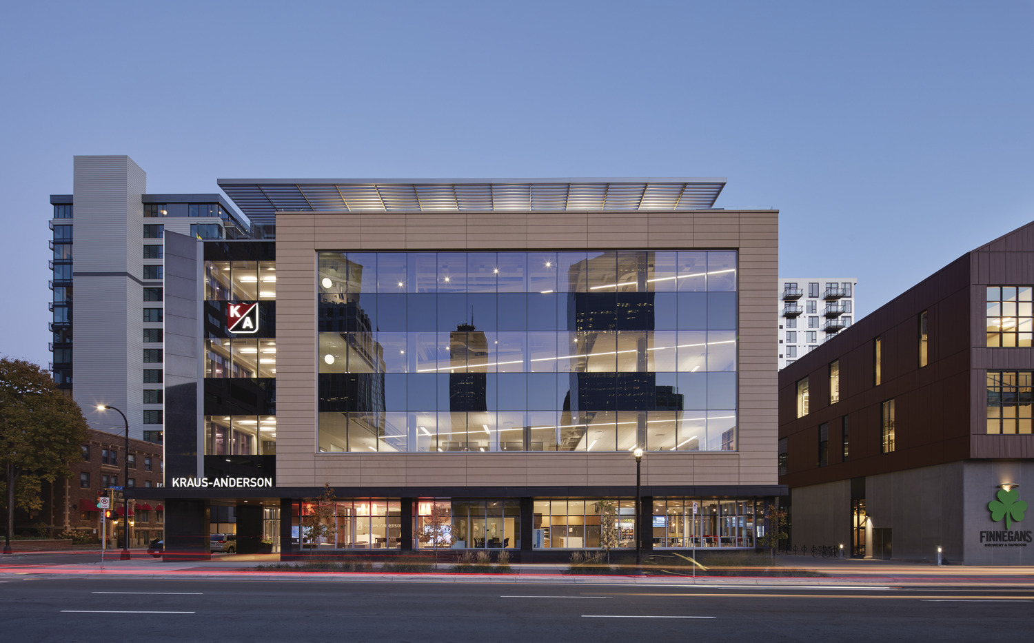 Redevelopment of Kraus-Andersonís downtown headquarters block replaced a 40-year old, two-story office building and surface parking lot with a creative mixed-use block development complementing the revitalization of East Downtown and the Elliot Park neighborhood. Elements include Kraus-Anderson headquarters; a five-story, 100,000 s.f. office consolidating three existing KA offices under one roof; a high rise, amenity-rich apartment building along the Portland Avenue residential and cycling corridor; an eight-story hotel with restaurant and catering; and Finnegans House, a three-story microbrewery, event center and offices for Finneganís featuring collaborative office spaces for other social entrepreneurial business startups. Underground parking and a green central courtyard further enhances the new block. https://www.youtube.com/watch?v=ceZUkxAugoU&t=188s