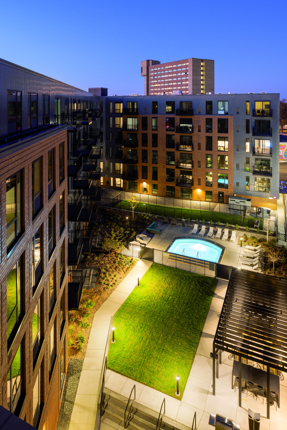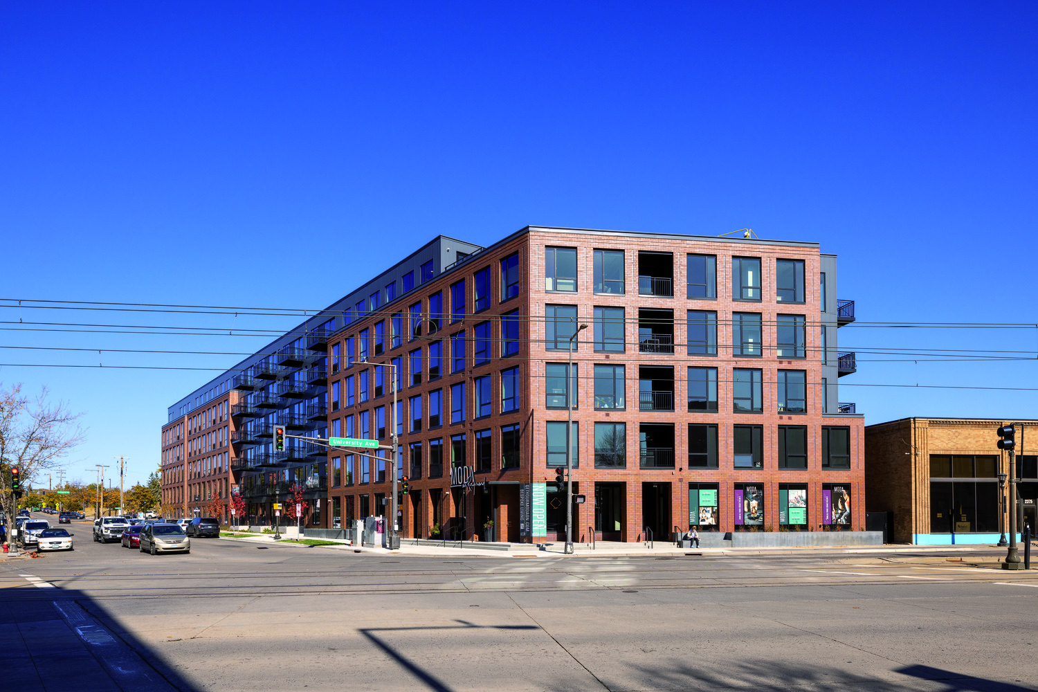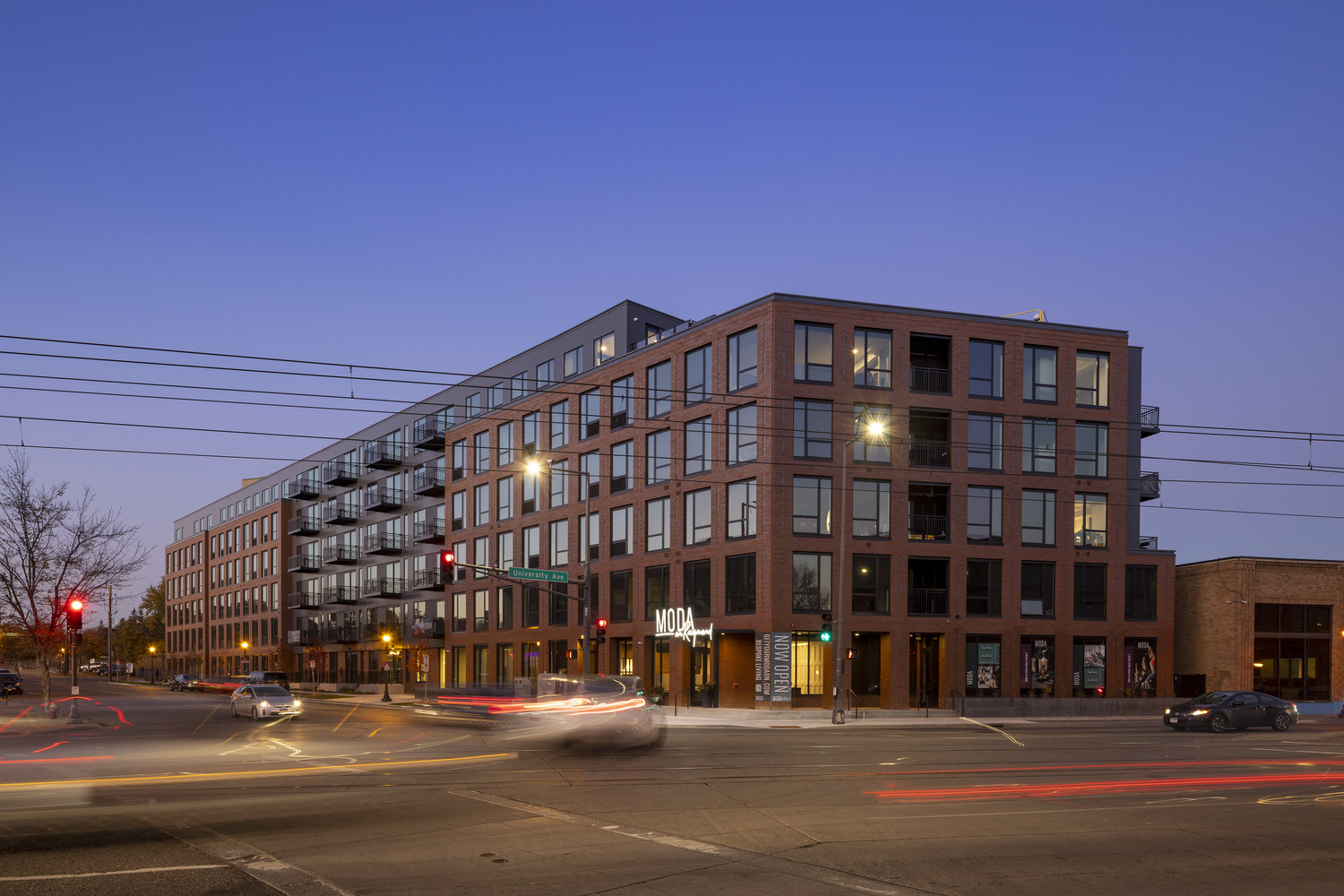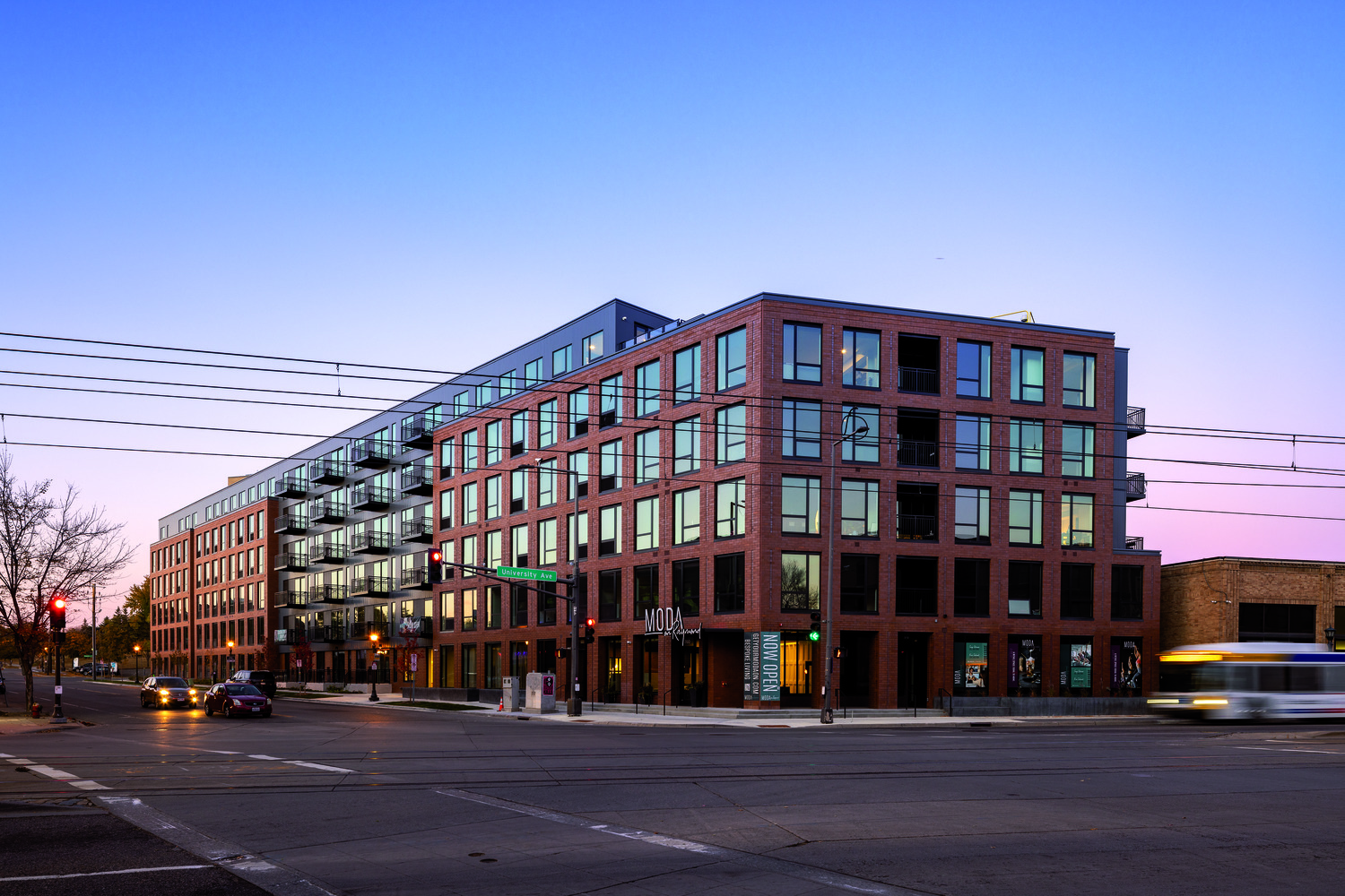 The 6-story wood-frame mixed-use apartment building on the corner of University Ave and Raymond Ave was completed by Kraus-Anderson Construction and developed by Kraus-Anderson Development. The former U.S. Bank site includes 222 units of market-rate rental housing located just one block from the Green Line Station in the St. Anthony Park neighborhood. The redeveloped 1.175 acre lot also includes 2,315-square-feet of commercial tenant space on the first floor. Rental offerings includes studio, alcove, one-bedroom and two-bedroom apartments ranging from 500-1100 square feet. Amenities include underground parking, fitness center, and outdoor courtyard with pool, clubroom, fully automated building access systems, rooftop patio, and a community incubator space.