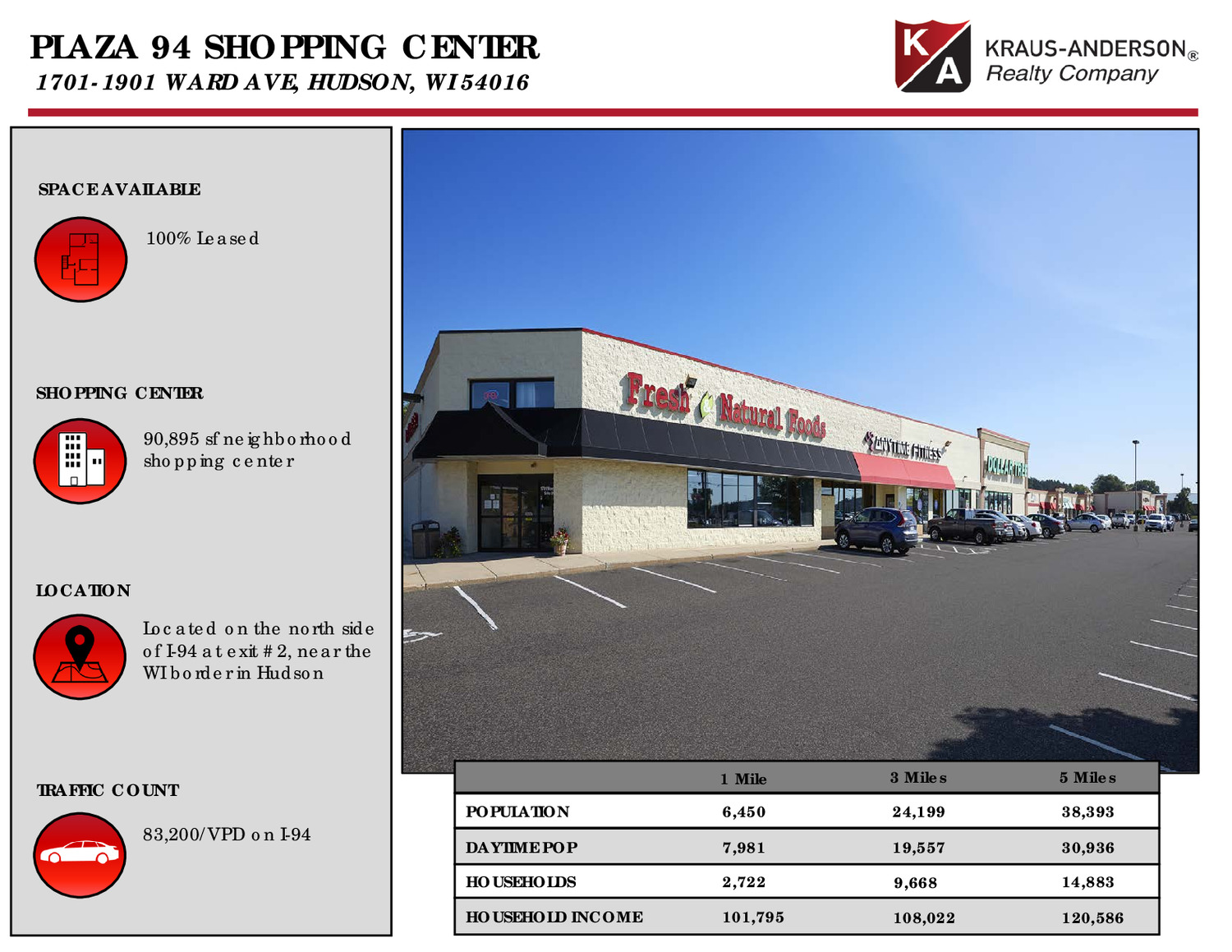 Located along I-94 and anchored by retailers such as the Hudson Bowling Center, Anytime Fitness, Maurices and Hudson Grocery Cooperative, this well-cared-for strip retail center serves both sides of the river. Major Tenants: Hudson Grocery Cooperative, Dollar Tree, Hudson Bowling Center, Hirshfield’s, Anytime Fitness