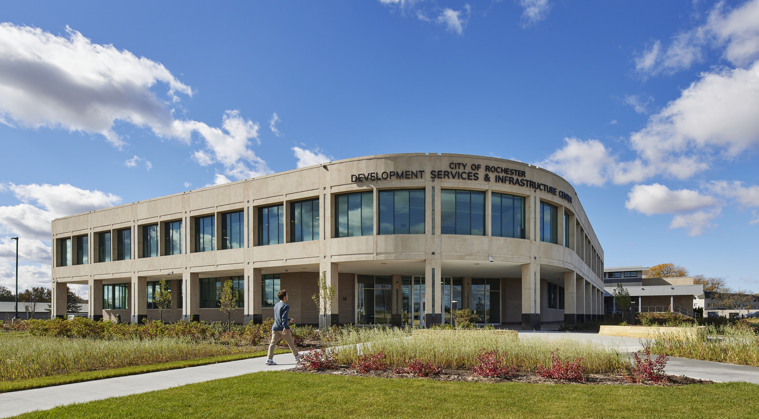 The Rochester North Service Center and Police Station is an adaptive reuse project that combines the Development Services and Infrastructure Center (DSIC) and the North Station for the Rochester Police Department (RPD). As space became limited at City Hall, the City of Rochester bought the former Think Bank building and land in 2016 in order to relocate the RPD and the Cityís newly formed DSIC team. Designed by BKV Group and constructed by Kraus-Anderson, the 43,200-square-foot project serves as a ìone-stop shopî for people in the city. The two-phased project began with renovating the existing bank building to accommodate DSIC staff. The second phase was the construction of a 54,600-square-foot precast concrete structure to house the RPD North Station. The Rochester North Service Center and Police Station earned a <a href="https://finance-commerce.com/2021/05/finance-commerce-announces-top-projects-of-2020/">Top Project of 2020 award</a> from Finance & Commerce.