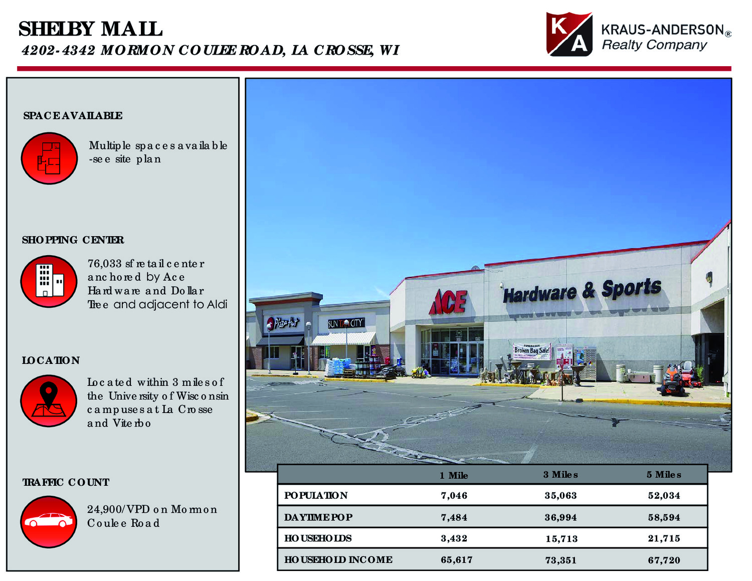 This 76,000 square foot retail center is shadow anchored by Aldi and positioned on well-traveled Mormon Coulee Road and within three miles of the University of Wisconsin campuses at La Crosse and Viterbo. A fixture of the south side of La Crosse since 1978, the renovated Shelby Mall has reemerged as an exciting component of the south side’s retail revitalization. Major Tenants: Ace Hardware, Dollar Tree, Pizza Hut